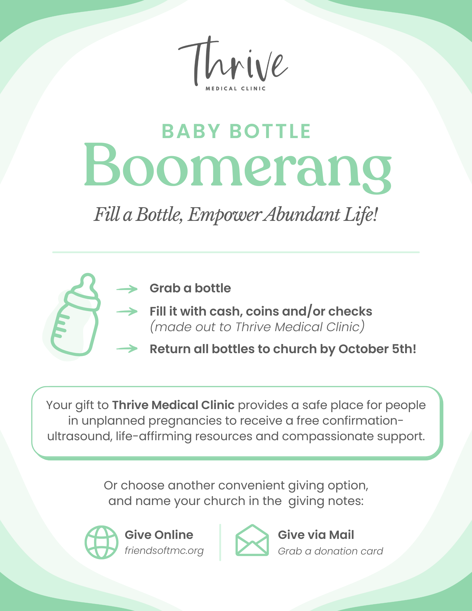 We made you a portal with all the tools you’ll need to make Baby Bottle Boomerang (BBB) a simple and impactful fundraising campaign with your church: dates and details for reference, digital slides, talking points and table print-out instructions, a new Impact Video, and more! And as always, you can reach out to Natalie with any questions at 231-929-3488 or natalie@thrivemedicalclinic.org.